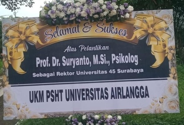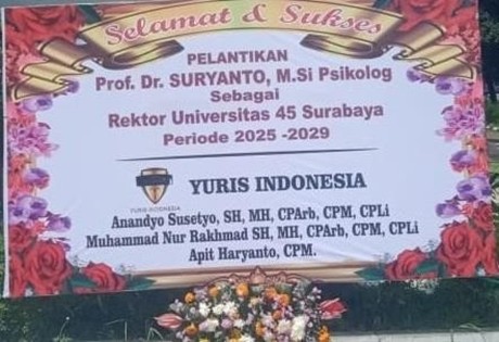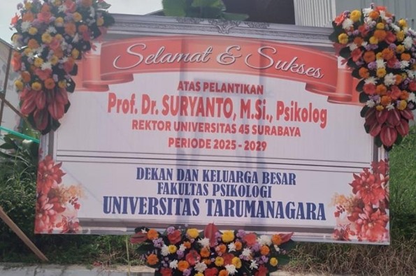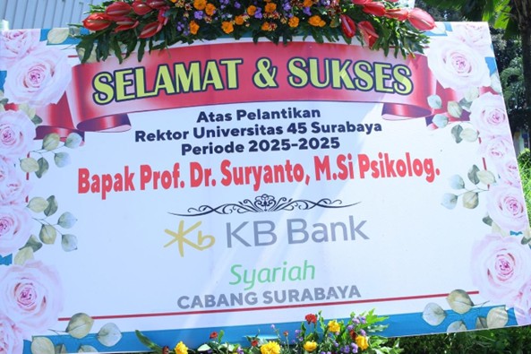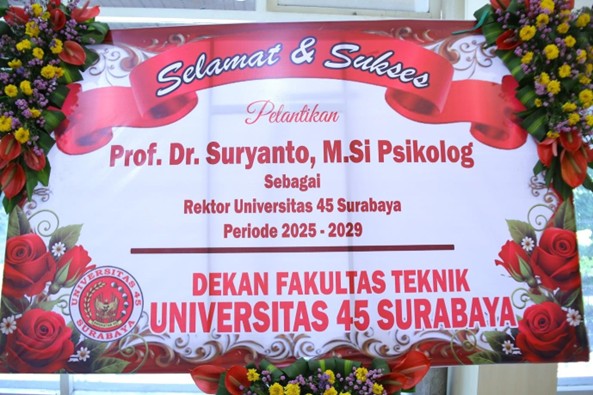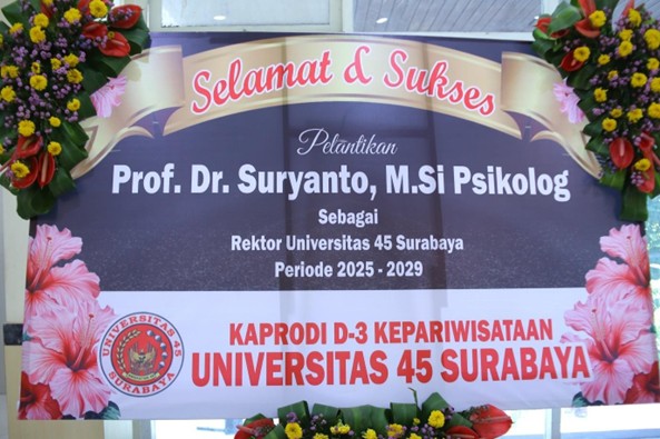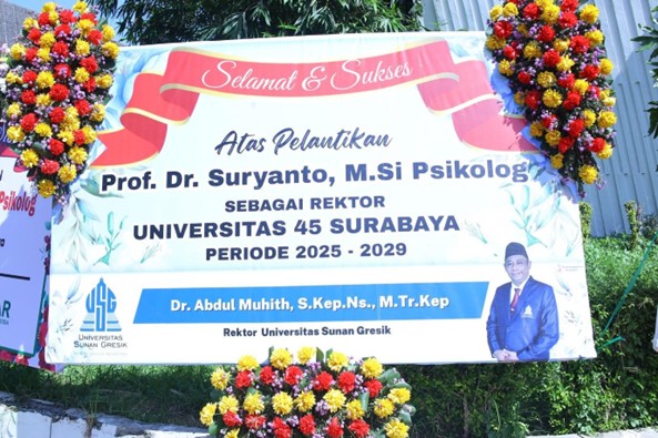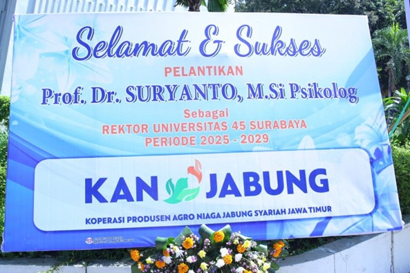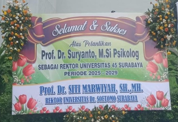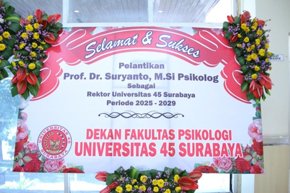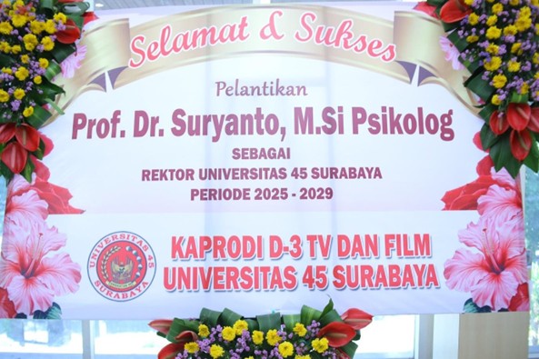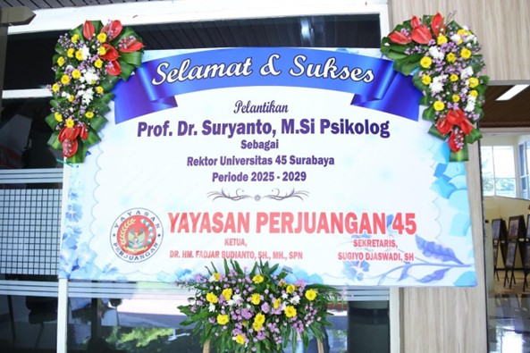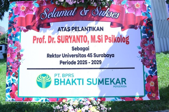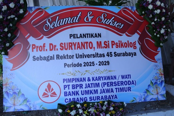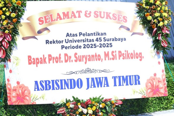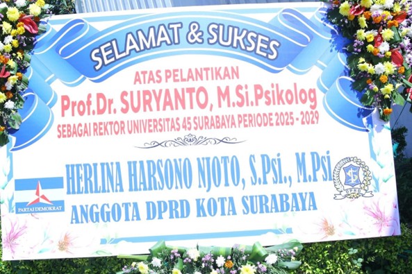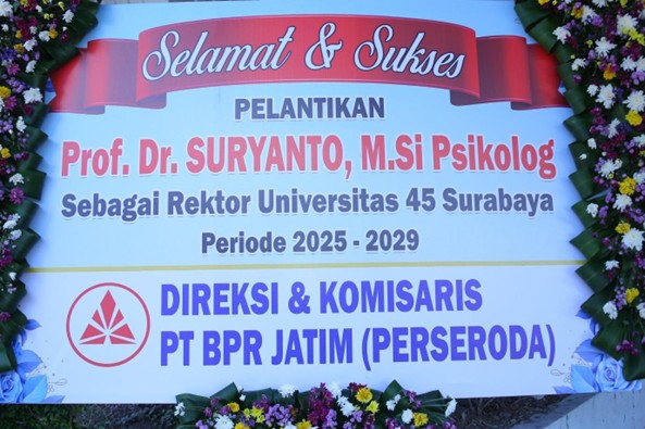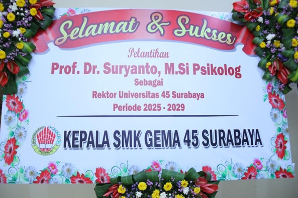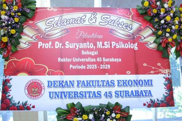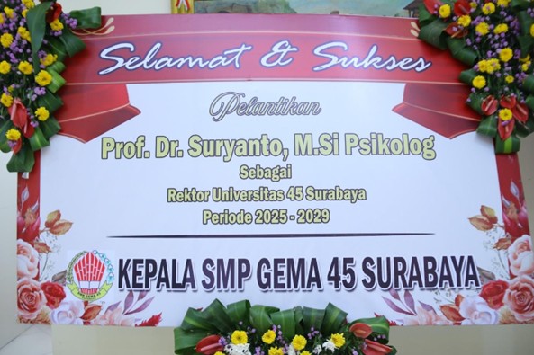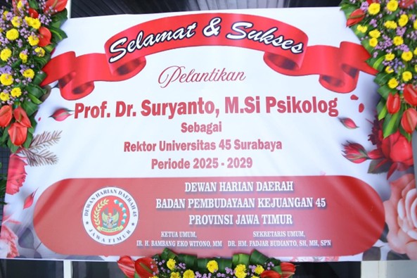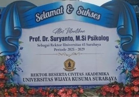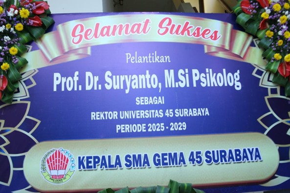 Surabaya, 17 Desember 2025 — Pelantikan Prof. Dr. Suryanto, M.Si., Psikolog sebagai Rektor Universitas 45 Surabaya masa bhakti 2025–2029 mendapat perhatian dan dukungan luas dari berbagai kalangan. Ucapan selamat dan sukses disampaikan oleh institusi, tokoh nasional, pimpinan perguruan tinggi, dunia usaha, serta civitas akademika dalam bentuk karangan bunga dan bunga segar.