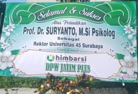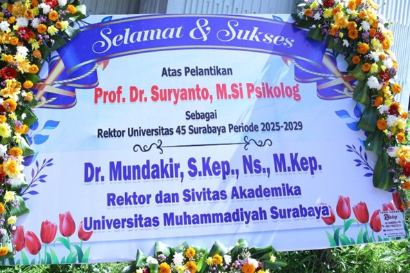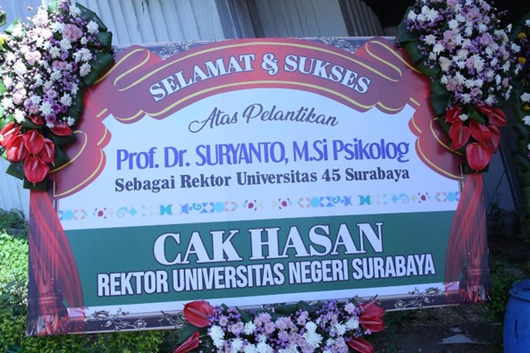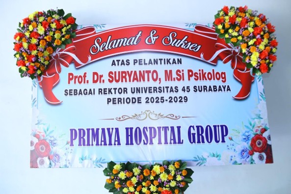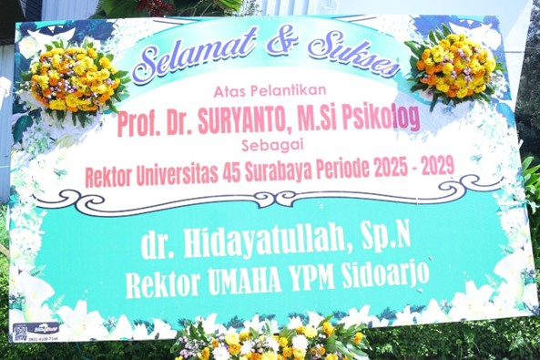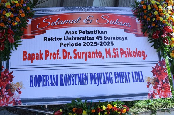 Seluruh karangan bunga dan bunga segar yang diterima menjadi simbol dukungan moral, kepercayaan, serta harapan besar agar kepemimpinan Prof. Dr. Suryanto, M.Si., Psikolog mampu membawa Universitas 45 Surabaya semakin maju, berkarakter, dan berdaya saing, tanpa meninggalkan jati diri perjuangan yang menjadi ciri khas universitas.